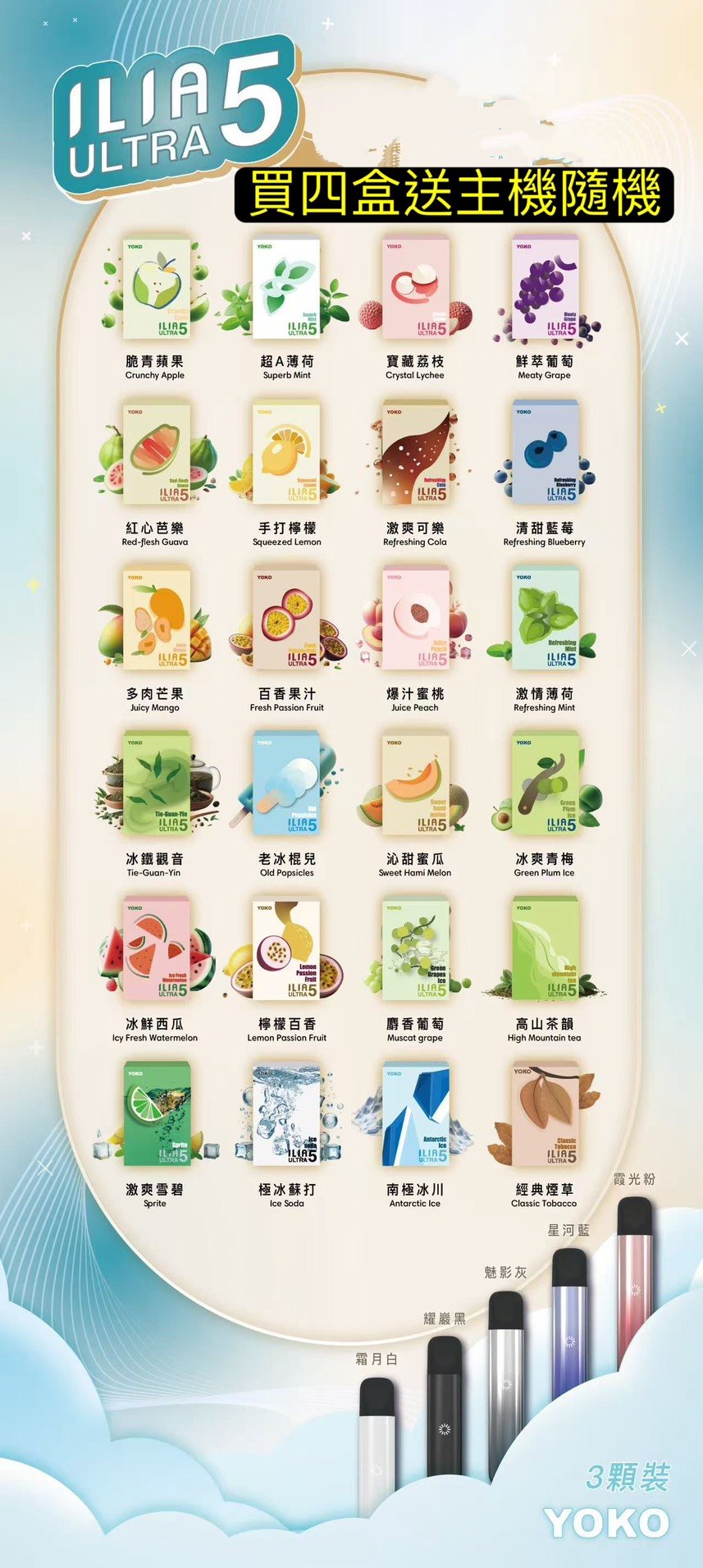 | 買四盒送主機隨機 | 蘋果, 超A薄荷, 荔枝, 葡萄, 芭樂, 檸檬, 可樂, 藍莓, 芒果, 百香果, 蜜桃, 激情薄荷, 鐵觀音, 冰棍, 檸檬百香, 澀香葡萄, 蜜瓜, 青梅, 西瓜, 高山茶, 雪碧, 蘇打, 南極冰川, 經典草, 主機4盒送隨機色主機 |